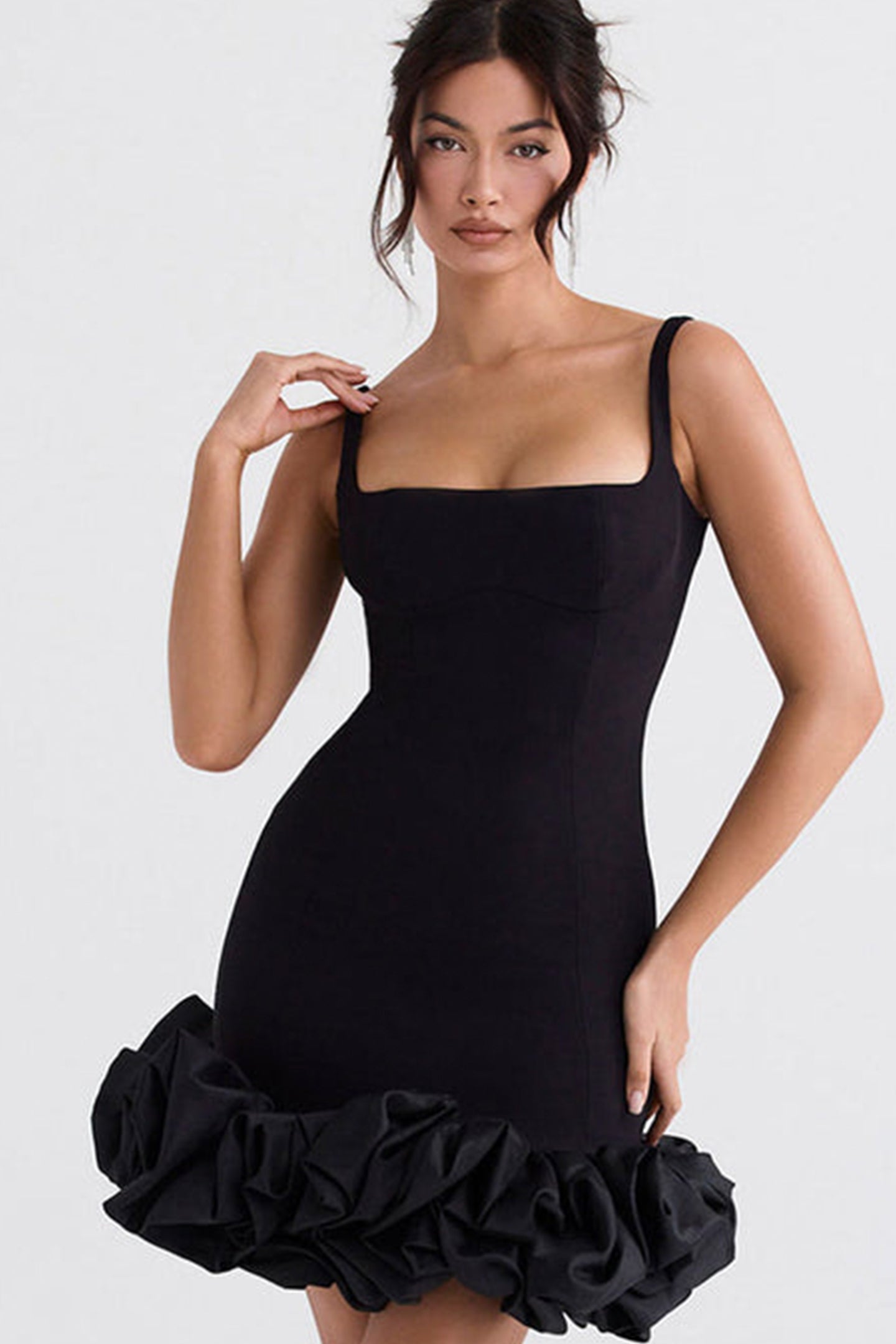 This mini bodycon dress features a square neckline with spaghetti straps and a playful ruffle detail. Perfect for a night out, it combines style with a touch of fun.