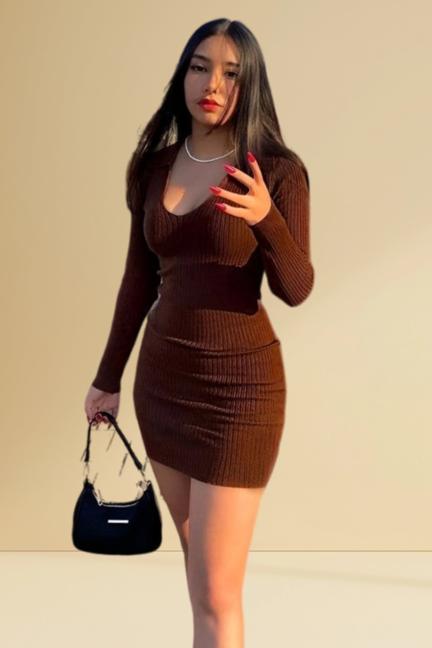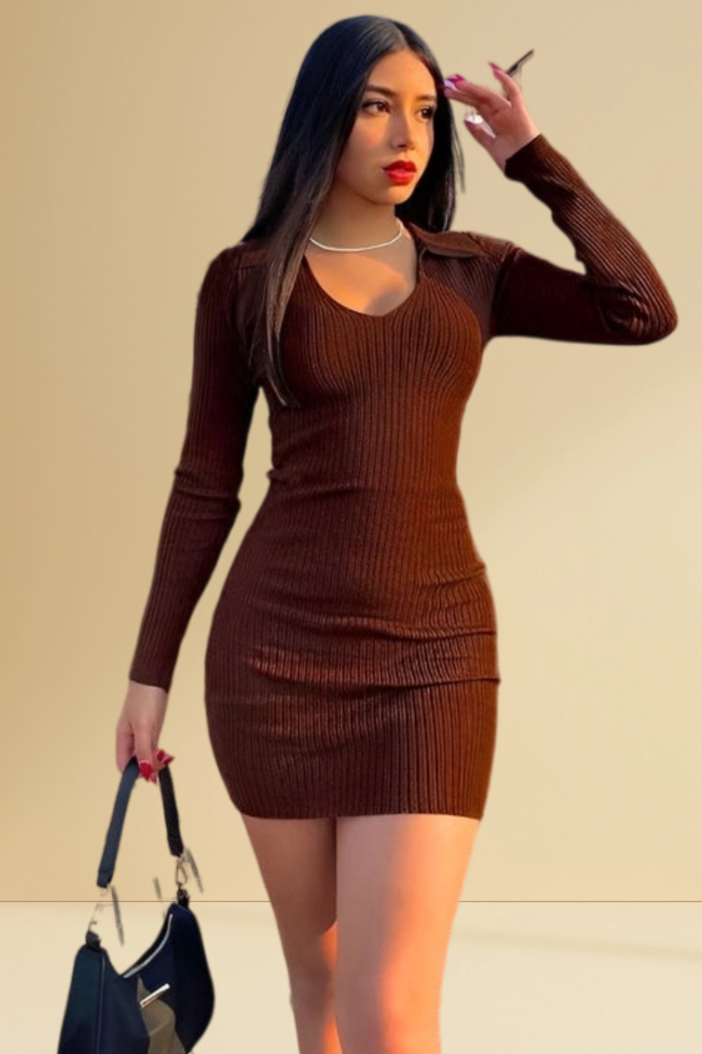 Casual yet chic, the Brown Ribbed T-shirt Dress features full sleeves and a collar for a refined look. Perfect for everyday wear, it combines comfort with contemporary style.