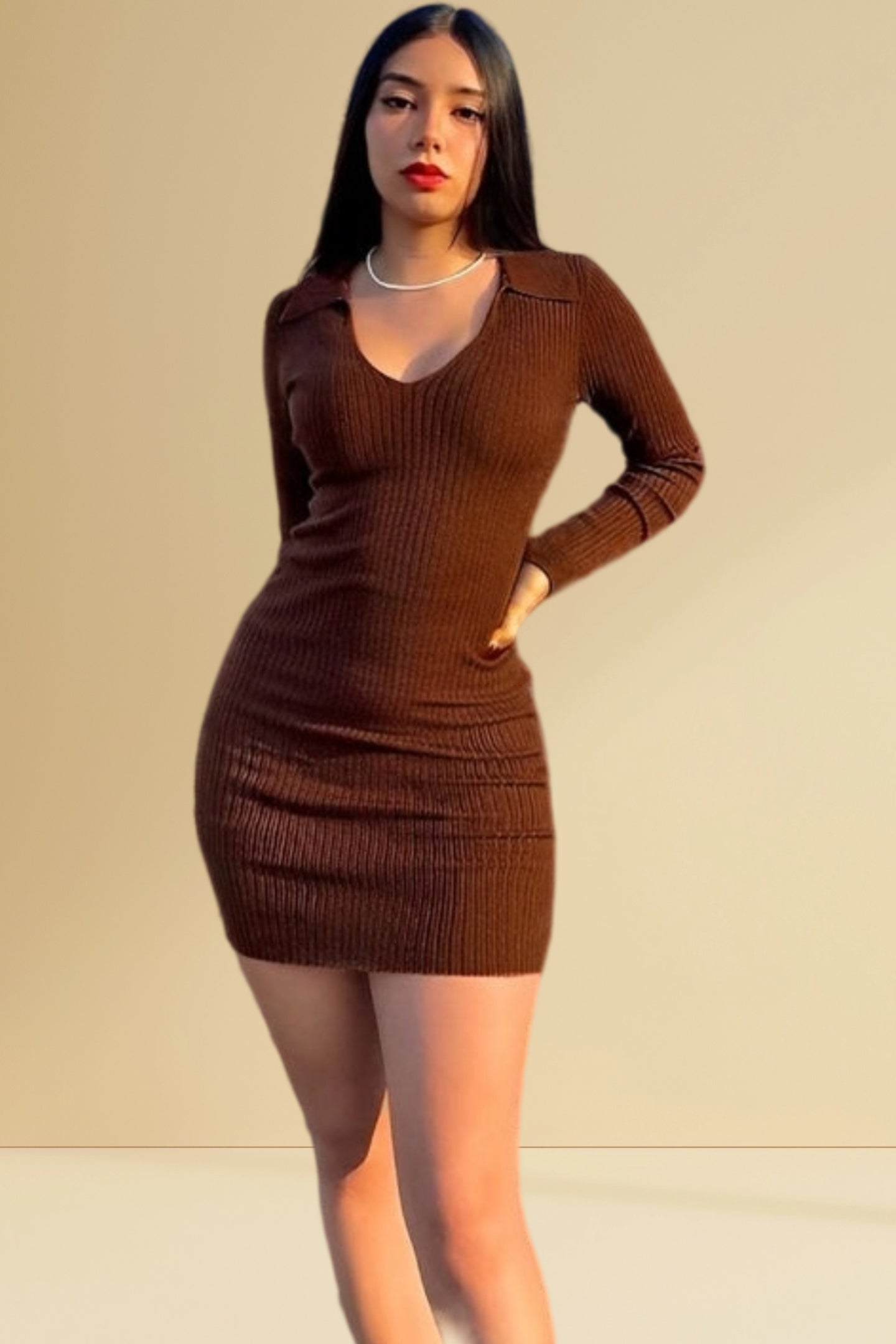 Fabric: Brown Ribbed Full Sleeves Collar T-shirt Dress