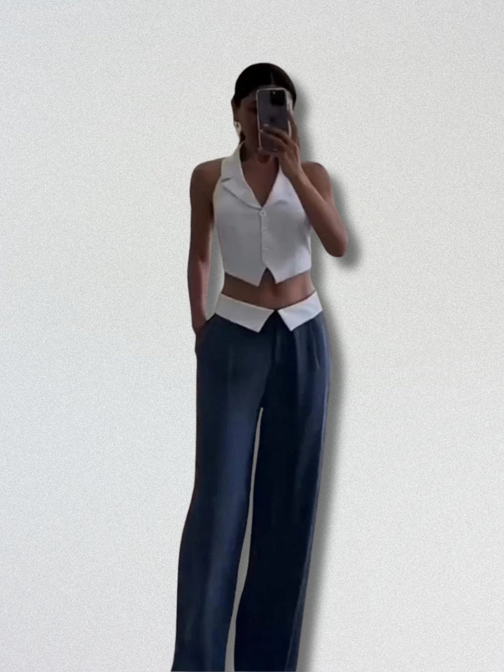 The Dual Tone Luxe Co-ord from Kyra Closet is tailored for timeless sophistication. Made from banana crape, it pairs an 18-inch crisp white waistcoat with sleek 41-inch navy pants. A perfect balance of contrast and elegance, this co-ord transitions effortlessly from workwear to evening sophistication.