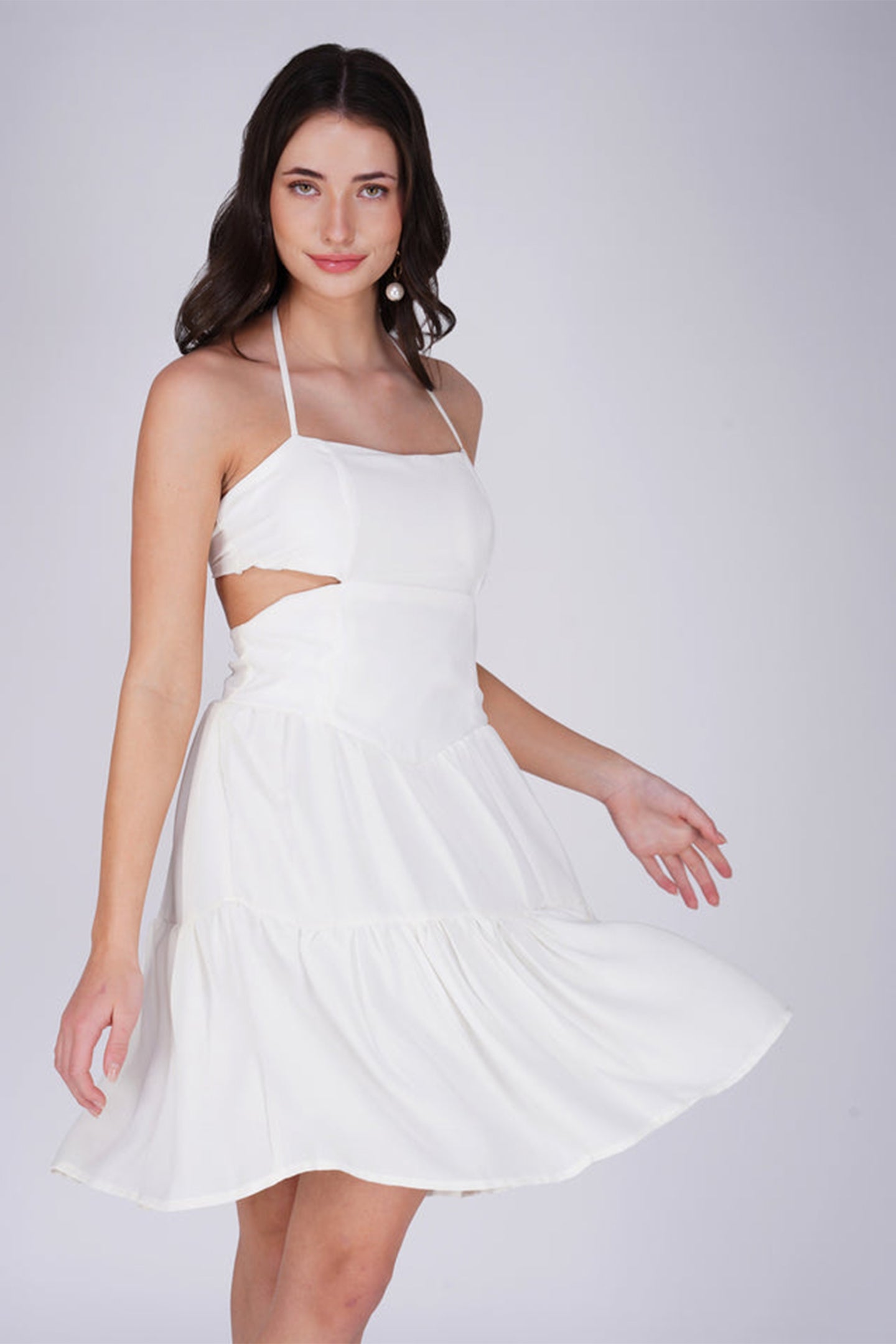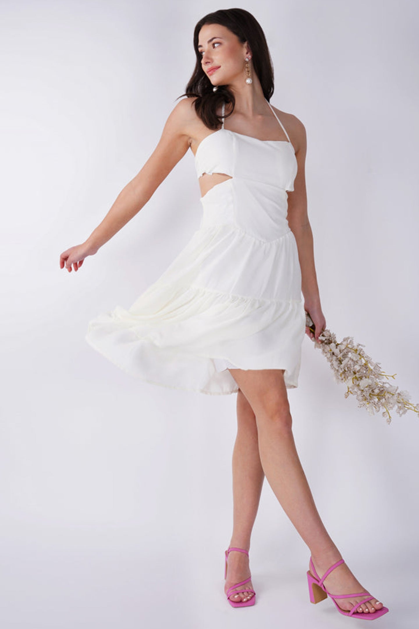 This short dress features a fit-and-flare silhouette with a cutout halterneck design. Perfect for day or evening wear, it offers a chic and feminine look with a touch of edge.