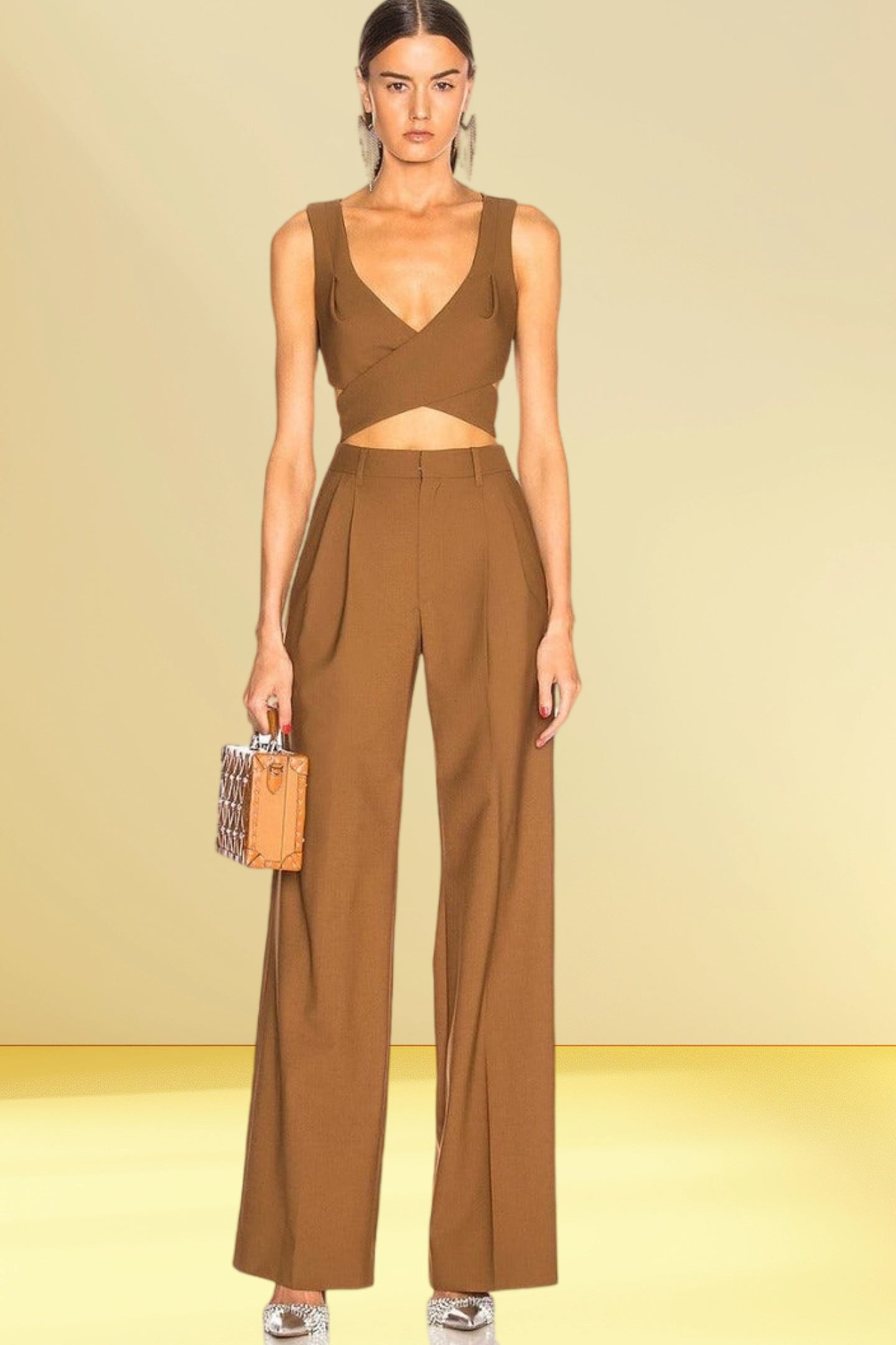 Sophisticated and stylish, the Laiden Coord Set features a backless V-neck top and high-waisted pants. This coordinated outfit is perfect for making an entrance at any formal event or evening gathering.