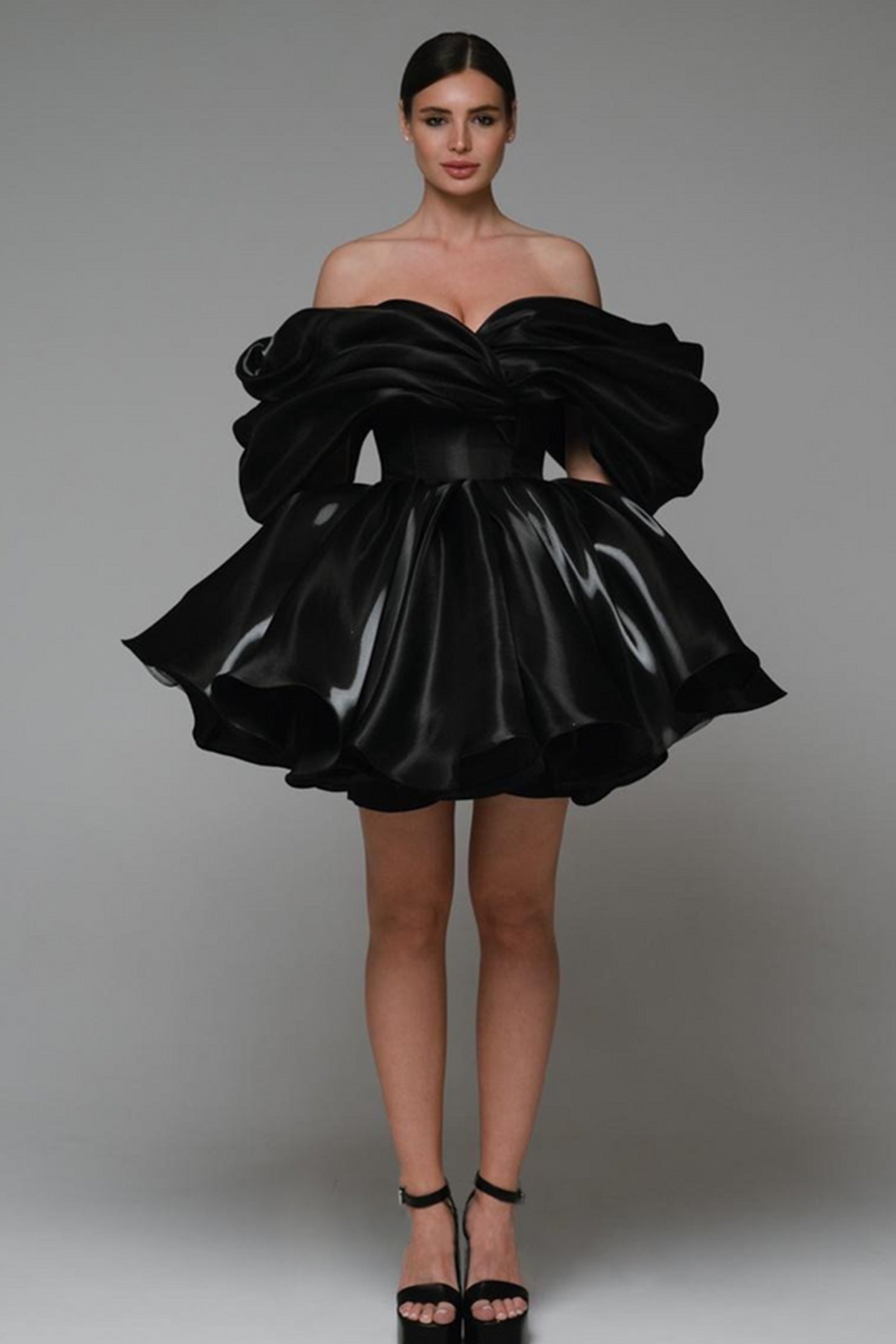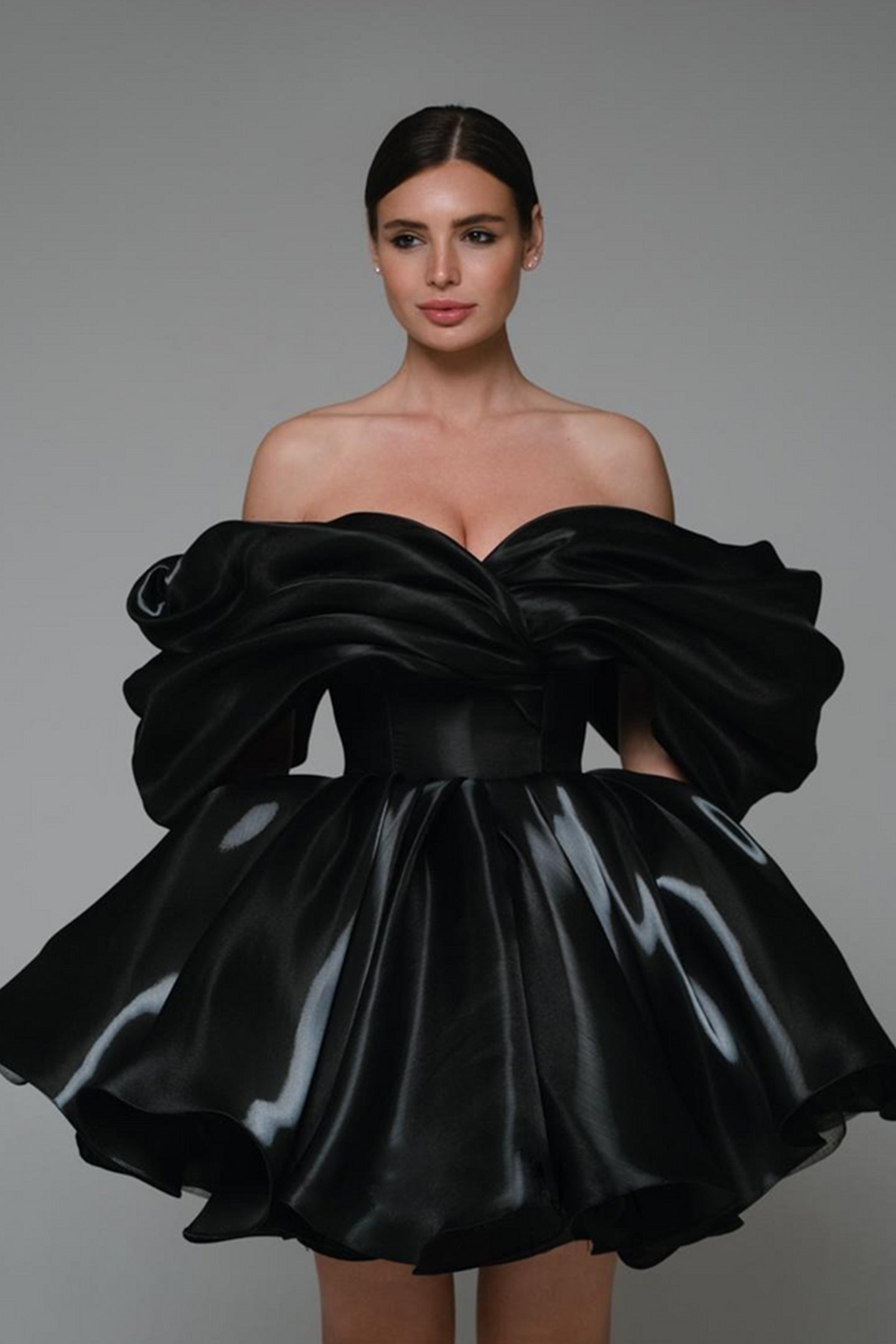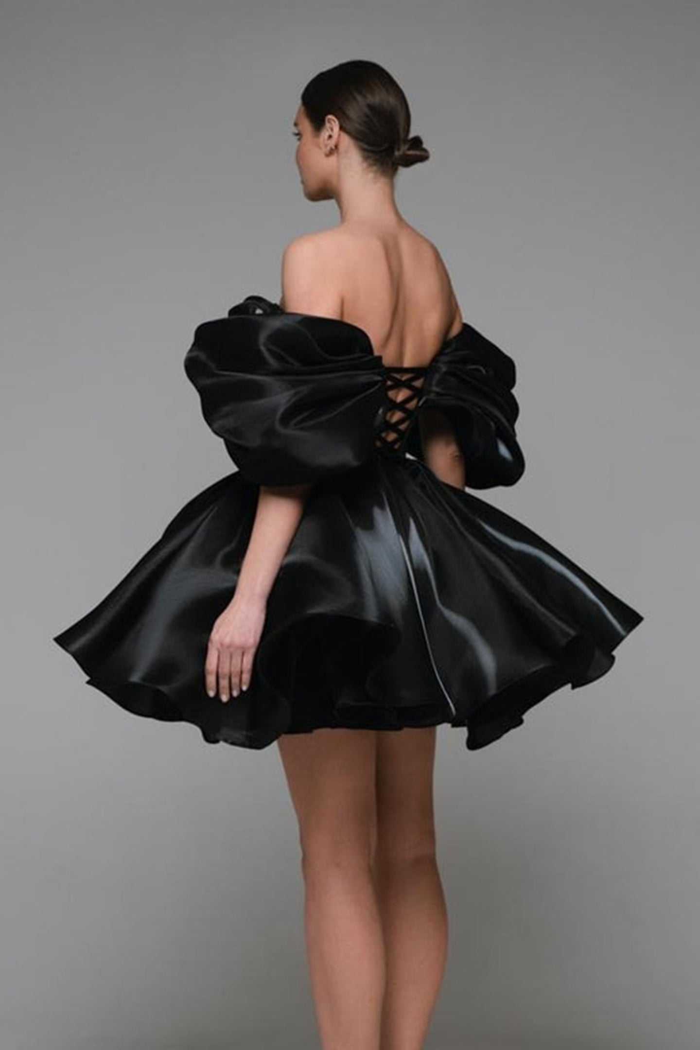 This mini dress combines an off-neck tube top with a backless design and a fit-and-flare silhouette. The versatile and flattering style is perfect for day-to-night wear.