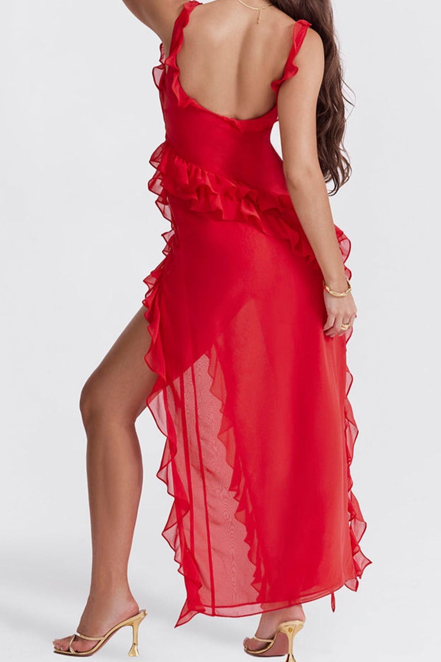 Turn heads in this red maxi dress with ruffle frills and a high slit. Its bold color and stylish design make it perfect for making a grand entrance at any special occasion.