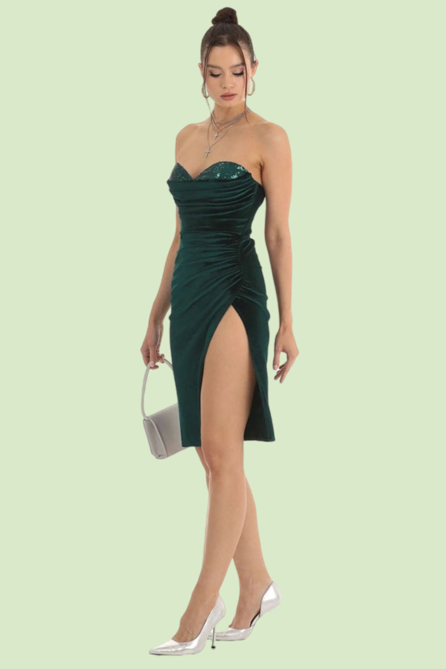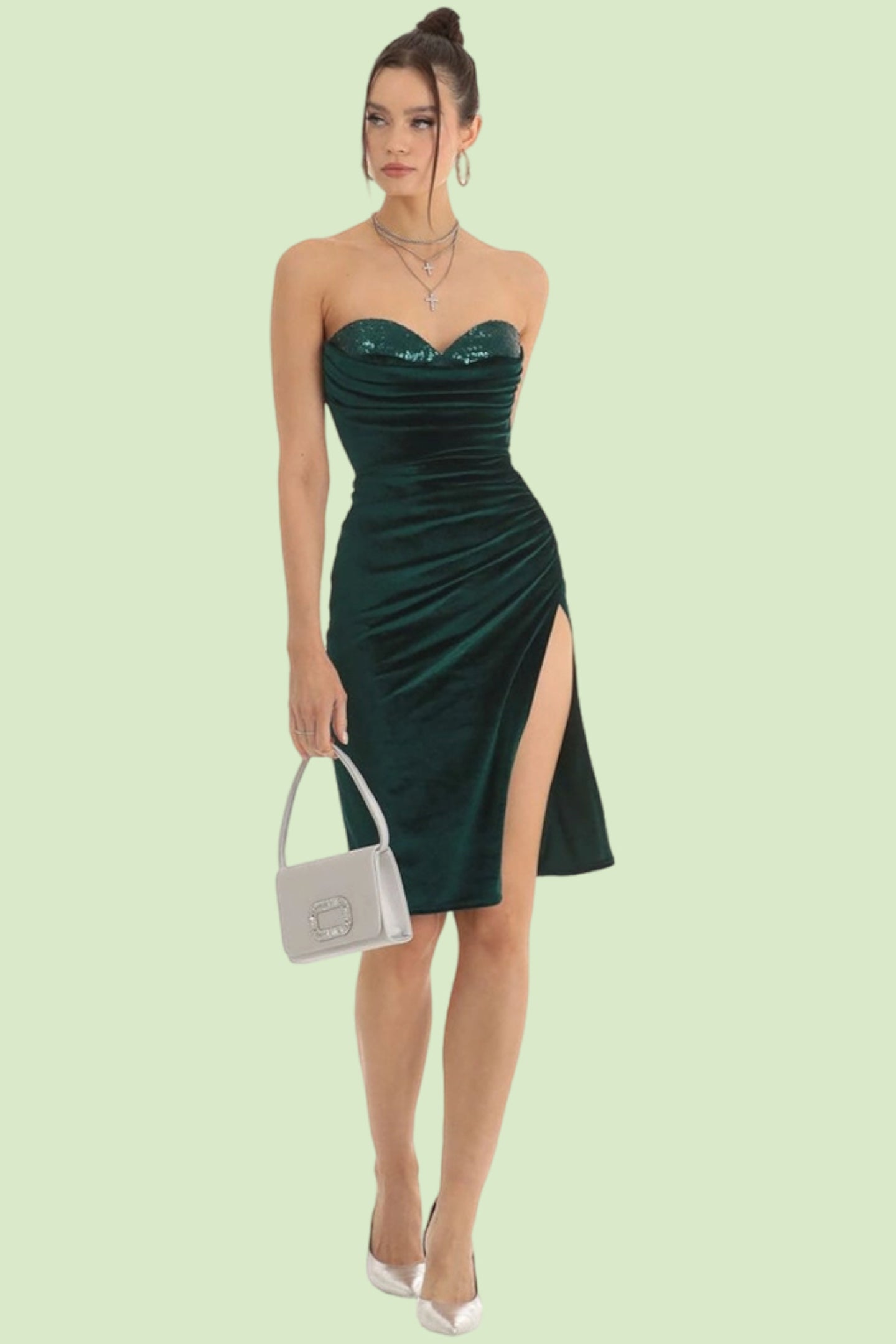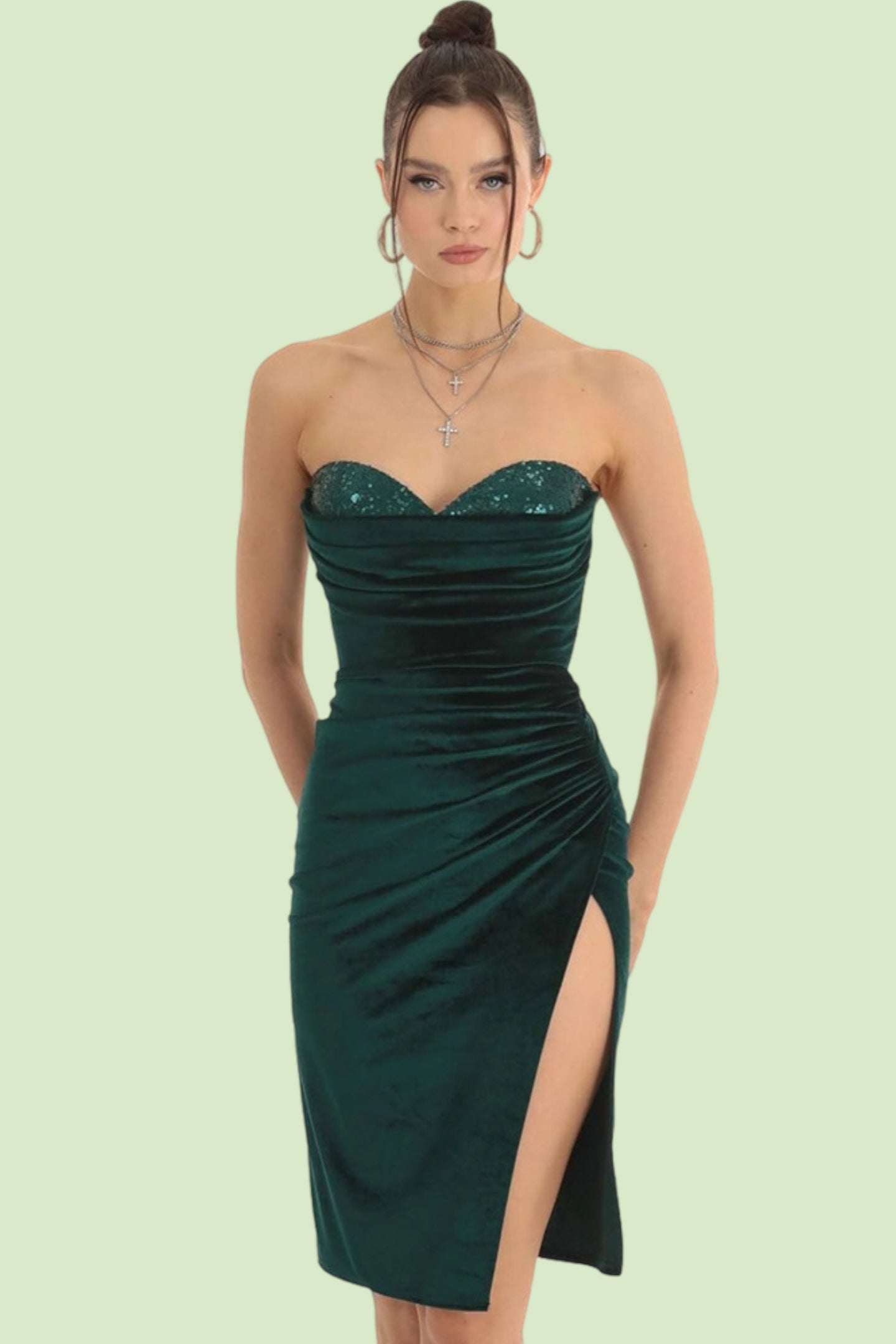 This dazzling sequined party dress is designed to accentuate your curves with a slim-fit silhouette and a daring side slit. The sling strap adds a modern touch, making this dress a standout choice for glamorous occasions.