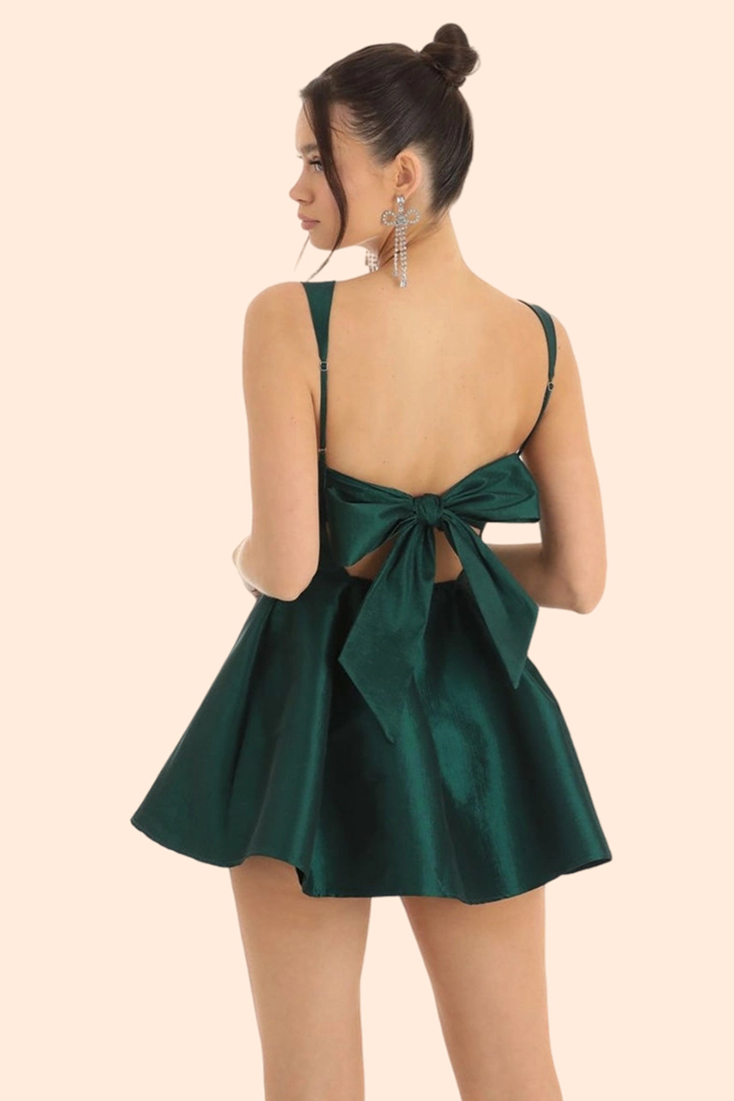 This Seraphina Emerald Skater Dress in dull satin features eye-catching sequin highlights and a chic back bow, perfect for a glamorous party look.