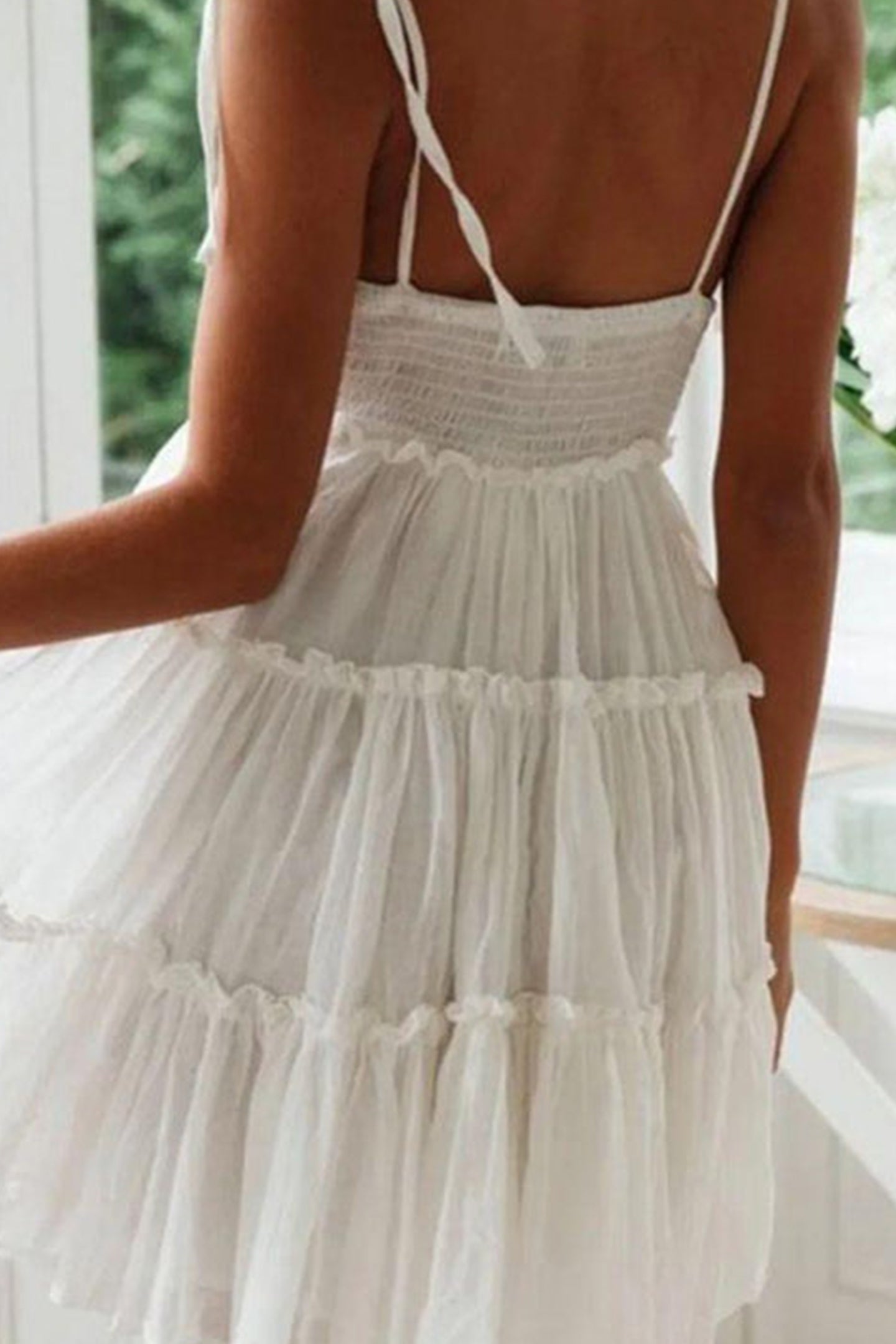 Light and breezy, the White Georgette Mini Dress is ideal for warm-weather occasions. Featuring tied spaghetti straps and a flowy skirt, this dress offers a chic and carefree vibe for casual summer outings or beachside brunches.