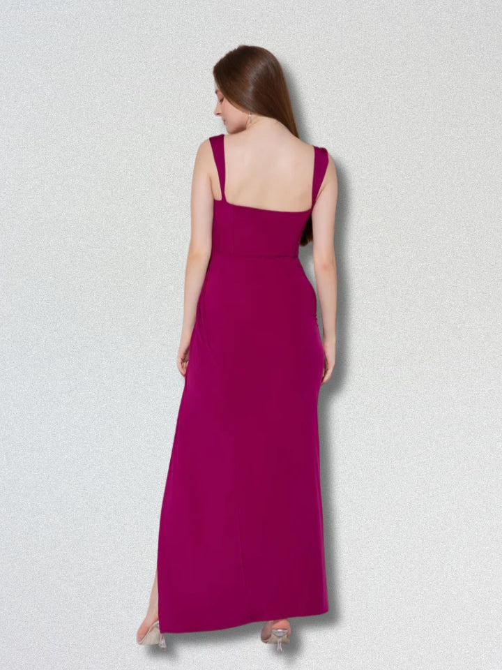 The Wine Glow Square Neck Maxi Dress from Kyra Closet is a statement in elegance. Crafted in premium 250 GSM nylon lycra, this 60-inch wine-purple gown is adorned with delicate bead and crystal work. With a padded finish and sleek silhouette, it’s perfect for galas, soirées, and evenings of refined glamour.